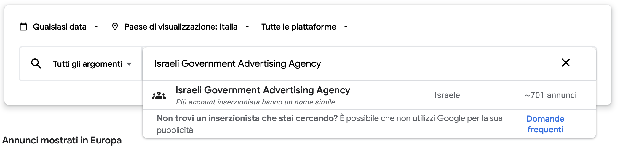 Secondo i dati ufficiali del Google Ads Transparency Center, ad agosto 2025 il governo israeliano ha all’attivo oltre 700 annunci pubblicitari. Qualche ora fa me n’è capitato proprio uno sotto gli occhi: